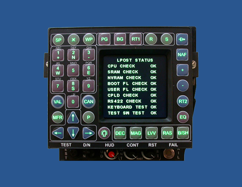 This cockpit display system of LCA enables the pilot to interface with the aircraft subsystems and HUD display through a number of illuminated, programmable keys and controls. A color LCD display provides vital data with Day / Night vision capabilities. The MF-UFCP is modular, compact, and can be customized to other aircraft. This unit has undergone Environmental tests as per Mil-STD-810E, Power supply Compliance tests as per MIL-STD-704D, and EMI/EMC tests as per MIL-STD-461D and is certified by CEMILAC